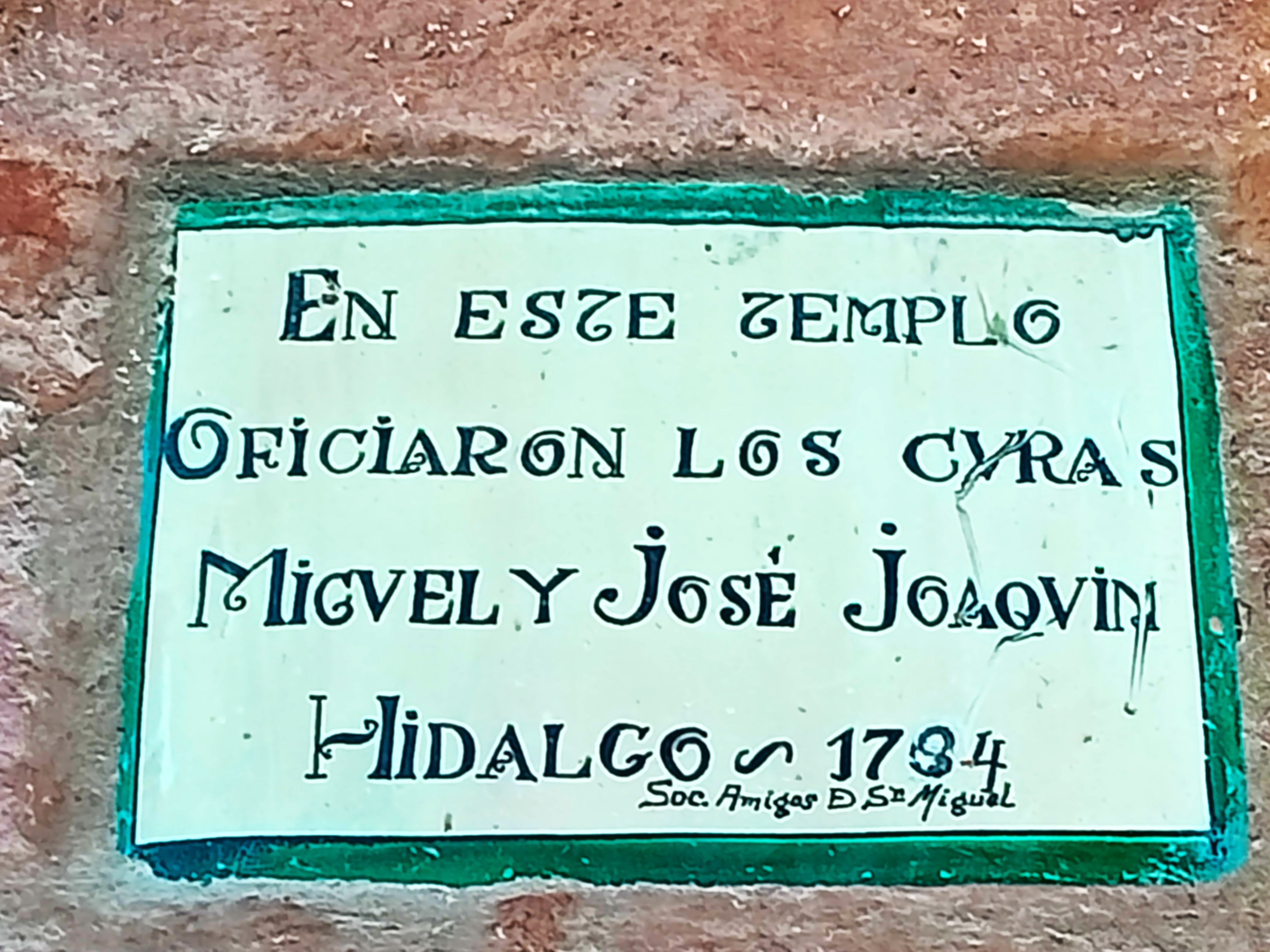 Placa conmemorativa que, en una parte de la fachada de la parroquia de San Miguel Arcángel, recuerda el hecho histórico ocurrido en el año 1784 –siglo XVIII– correspondiente a la presencia de los sacerdotes Miguel Hidalgo y Costilla y de su hermano José Joaquín como oficiantes en la parroquia de San Miguel Arcángel de la entonces villa de San Miguel el Grande.