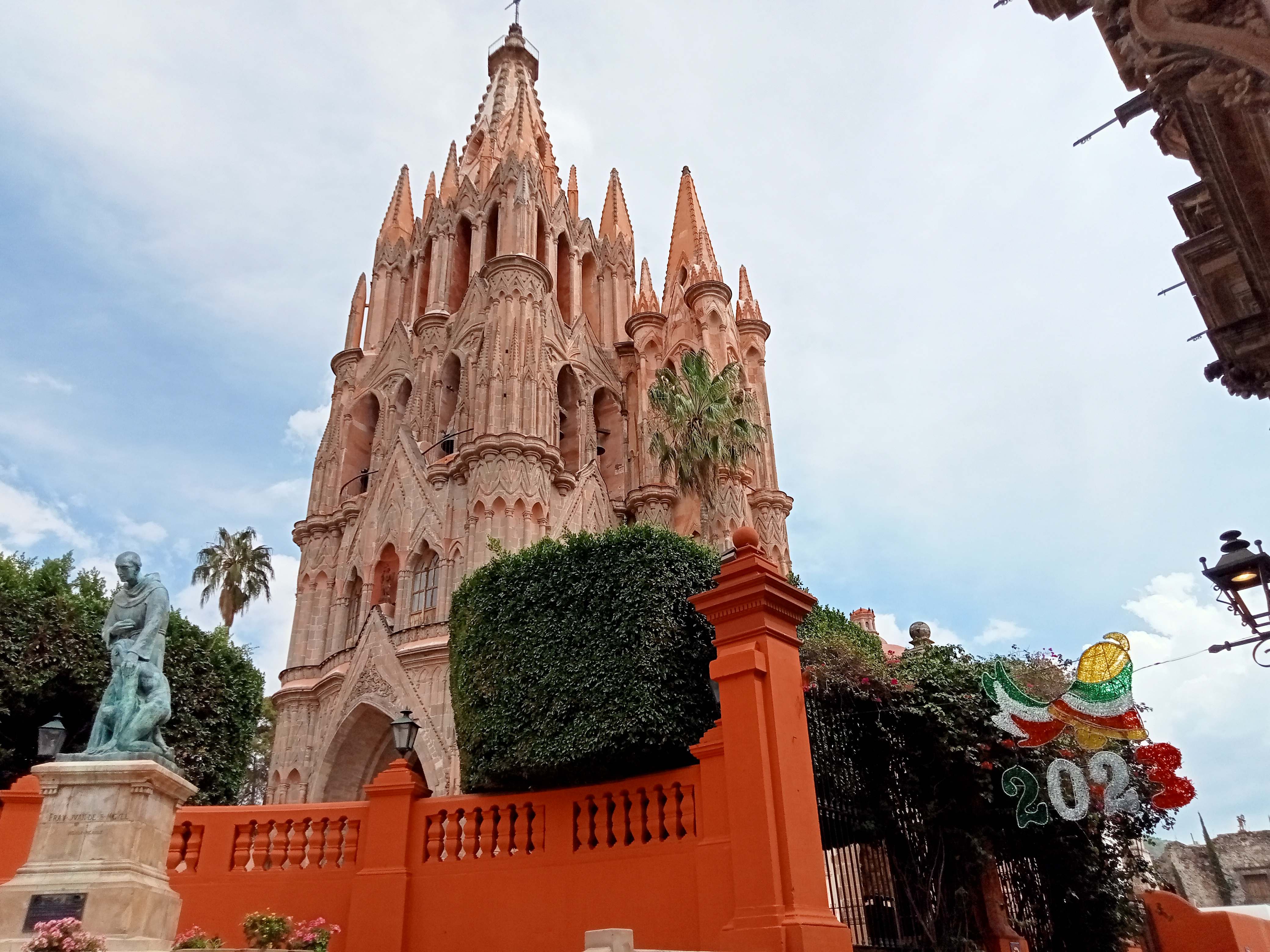 El monumental Templo de San Francisco, uno de los edificios religiosos más visitados por los sanmiguelenses y visitantes nacionales y extranjeros. Vista desde la Plaza Cívica, al pie de la escultura de Ignacio de Allende, conocida coloquialmente como “El caballo”; que personifica al héroe insurgente en el fragor de la batalla por la libertad nacional.